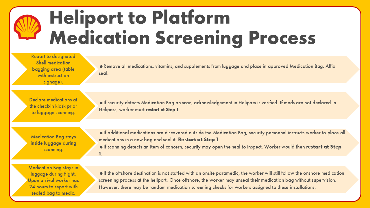 - 🩺 Medication Review: If a medication is not on the upcoming published list, Shell Health physicians will review as requested by the paramedic. Many medications not listed are still acceptable, so do not stop any prescribed medication without guidance from your prescriber. The review process is designed to ensure safety offshore. In rare cases, workers on medications with sedating effects may require extra care offshore, and sometimes additional follow-up with your physician may be needed. If your installation does not have a paramedic, you may open after arrival. Random medication reviews may be conducted at these locations from time to time.
